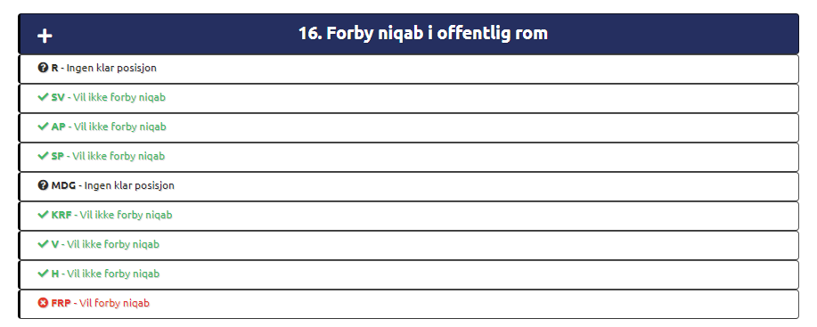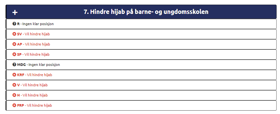 Det er åtte spørsmål om hijab, to om niqab og ett om burkini. På spørsmål om niqab i det offentlige rom ville selv Taliban smile varmt. Det er kun FrP som vil forby dette. Her er det fritt frem.