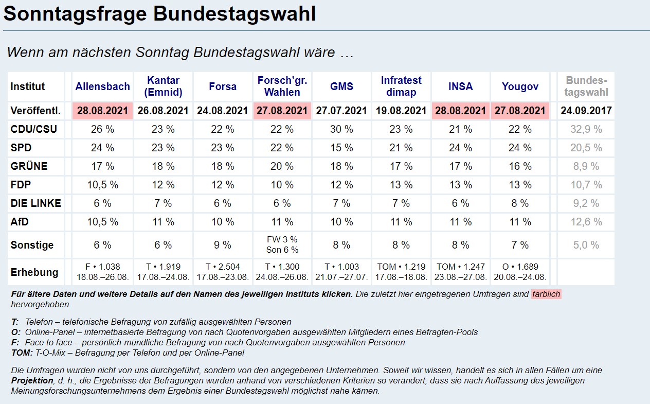 Valget på ny forbundsdag i Tyskland holdes 26. september, og så langt har det ikke utkrystallisert seg noen klare regjeringsalternativ. SPD og De grønne ligger an til å oppnå rundt 40 prosent, og noe av det samme kan et eventuelt samarbeid mellom CDU og FDP ligge an til. Følgelig er det lite trolig at noen av konstellasjonene vil klare seg uten støtte fra et av de såkalte randpartiene, dersom da ikke de to store SPD of CDU igjen finner sammen i en storkoalisjon.
