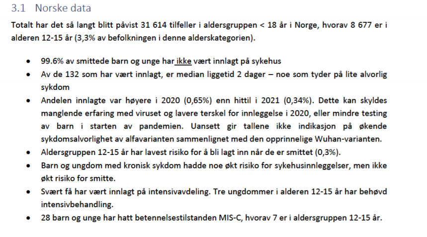 Anbefalingen fra FHI er på 40 sider (PDF). Anbefalingen viser til at barn generelt blir mindre syke enn voksne.