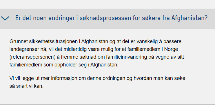 UDI har endret reglene for familiegjenforening for folk fra Afghanistan, slik at søkere slipper å møte opp personlig ved den norske ambassaden i Pakistan. Søknadene kan nå sendes av referansepersoner i Norge.