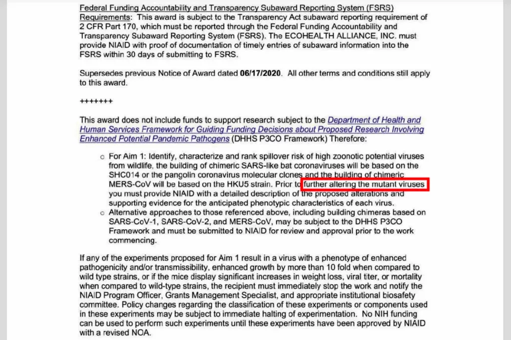 “The materials show that the 2014 and 2019 NIH grants to EcoHealth with subcontracts to WIV funded gain-of-function research as defined in federal policies in effect in 2014-2017 and potential pandemic pathogen enhancement as defined in federal policies in effect in 2017-present.”