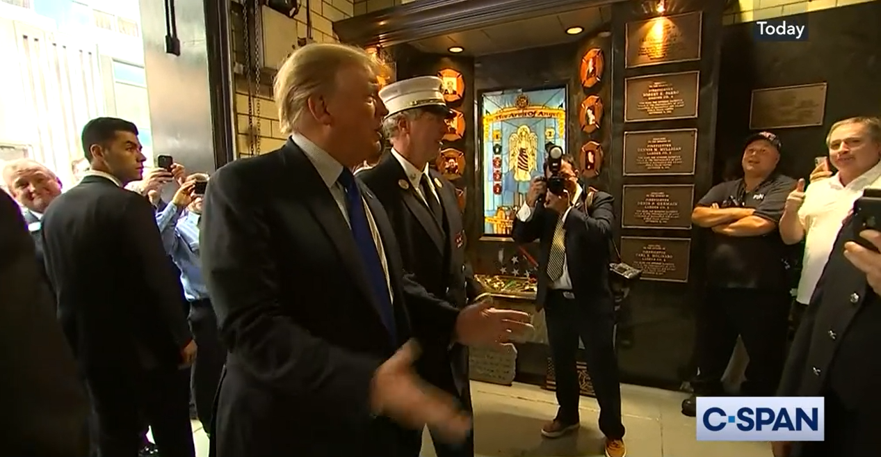 Donald Trump brukte 11. september på å besøke politifolk og brannfolk i New York, for å hylle den innsatsen disse gjorde i forbindelse med terrorangrepet for tyve år siden.