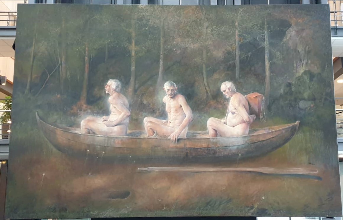 Vi skjønner jo at disse tre gubbene ikke har tatt seg en fristund fra gamlehjemmet. Båten og landskapet er heller ikke tilpasset en forfriskende seilas i Guds frie natur. Det er også uklart om båtene i det hele tatt har vann under kjølen. Uansett er det Kharons båt gubbene sitter i, som i gresk mytologi fraktet de døde til dødsriket. Kharon selv er ikke med på ferden og det skal vi merke oss. De gamle mennene er heller ikke døde, ennå. De sitter i vent på undergangen, på at den menneskelige sivilisasjonen skal kollapse av mangel på frisk luft og åndelig næring.