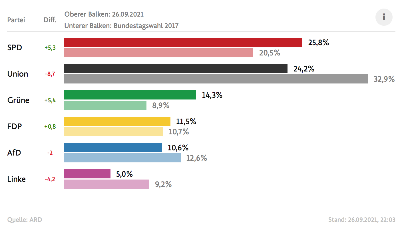 Ifølge en oppdatert valgprognose fra den tyske allmennkringkasteren ARD ligger det sosialdemokratiske partiet SPD an til å få 25,8 stemmene, mens unionspartiene CDU/CSU ventes å få 24,2 prosent – et avvik på over halvannet prosentpoeng. Dermed er Olaf Scholz favoritt til å bli ny statsminister etter Angela Merkel.