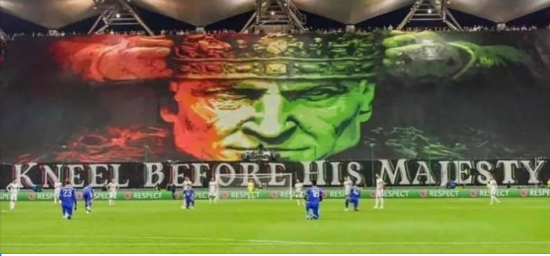 Legia-fansen var forberedt. Rett før den forventede knelingen rullet de ut et gigantisk banner, med teksten «Kneel before his majesty».