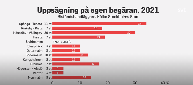 Situasjonen i områdene som regnes som utsatte områder er spesielt anstrengt. SVT rapporterer hvordan elleve av 32 bistandsoffiserer og hver femte sosialsekretær ved Socialtjänsten i distriktet Spånga-Tensta i Vest-Stockholm forlot sine stillinger i 2021. Den store personalutskiftingen fører til at nyansatte blir kastet rett ut i tunge arbeidsoppgaver, ofte uten tilsyn. Den store arbeidsmengden får da mange til raskt å søke på andre jobber. Men krisen handler ikke bare om en høy arbeidsmengde.