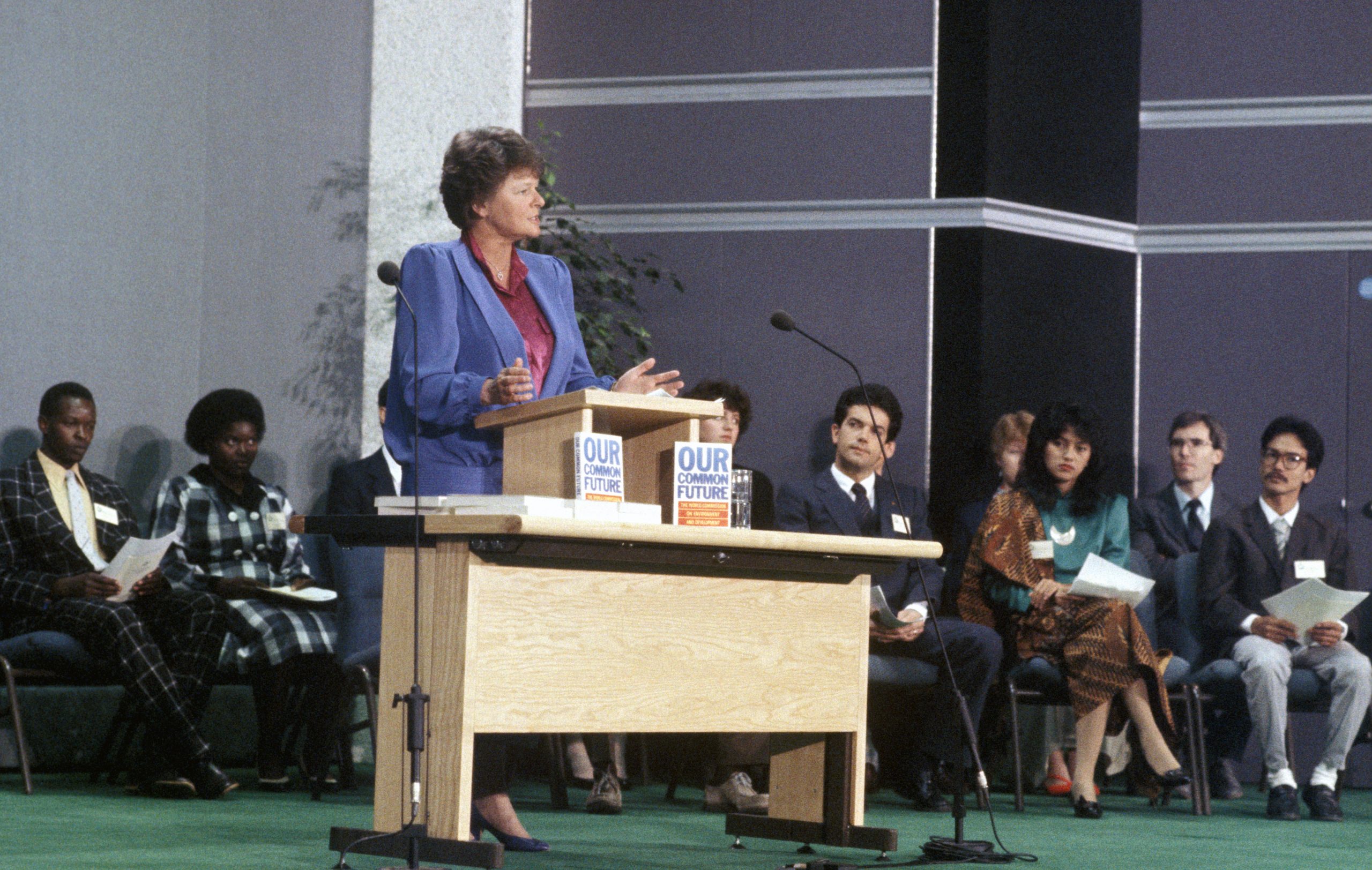 Gro Harlem Brundtland presenterer miljørapporten «Our Common Future» fra Brundtland-kommisjonen for miljø og utvikling i London den 27. april 1987. Foto: Henrik Laurvik / NTB.