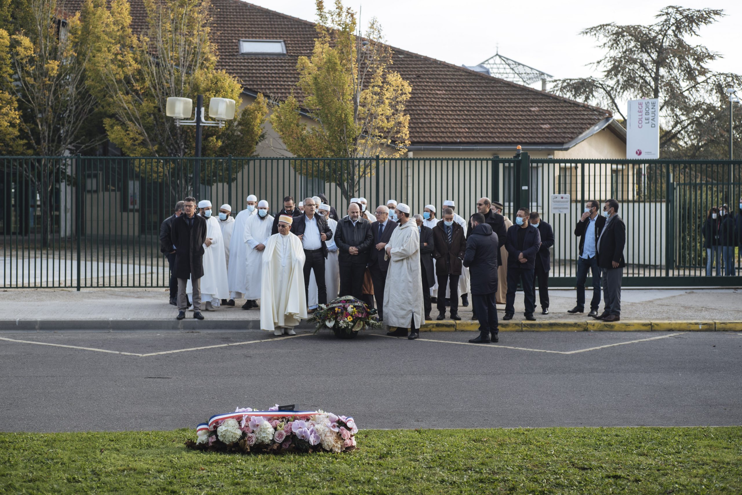 På ettårsdagen for henrettelsen av Samuel Paty samlet imamene fra Grand Mosque i Paris seg utenfor skolen hvor han underviste. Drapet er altså ikke glemt. Billedtekst: Imams from the Grand Mosque of Paris pay tribute in front of the school where teacher Samuel Paty worked, in Conflans Sainte Honorine, Friday, Oct.15, 2021. French schools are paying tribute to a teacher beheaded by a radical Islamist last year after he showed caricatures of the prophet of Islam to his class. Samuel Paty, a history and geography teacher, was murdered on Oct. 16 last year near his school in a northwest Paris suburb by an 18-year-old of Chechen origin who had become radicalized. (AP Photo/Lewis Joly)