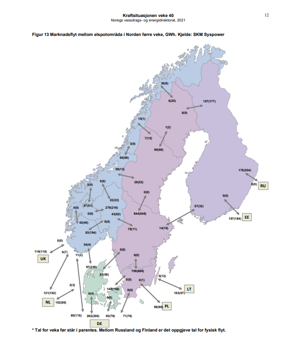 Et eksempel: Til Storbritannia eksporterte Norge 118/119 GWh de to siste ukene. Import = 0/0 GWh.
