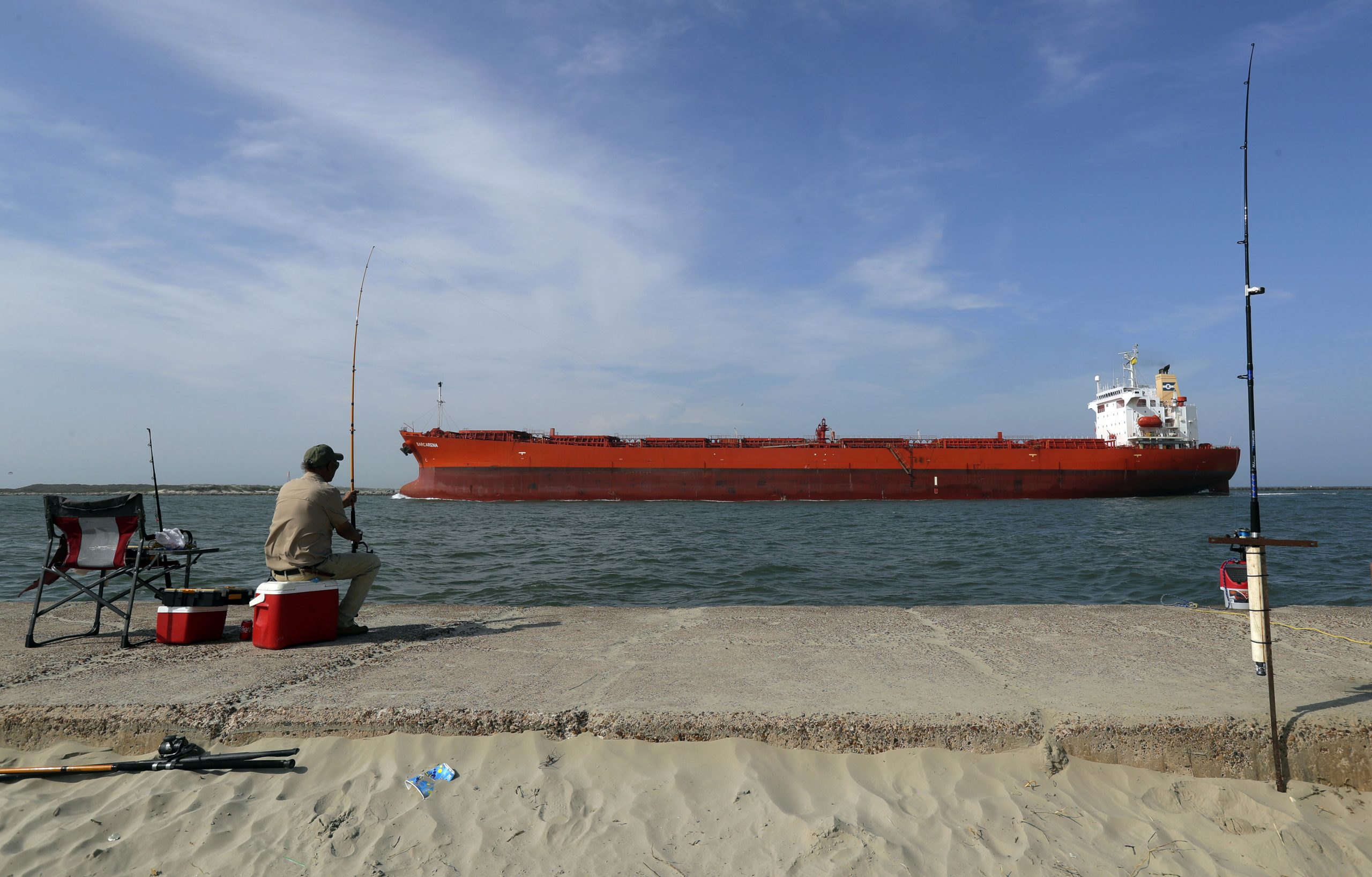 En mann fisker mens en oljetanker passerer forbi i Port Aransas, Texas, den 8. mai 2020. Foto: Eric Gay / AP / NTB.