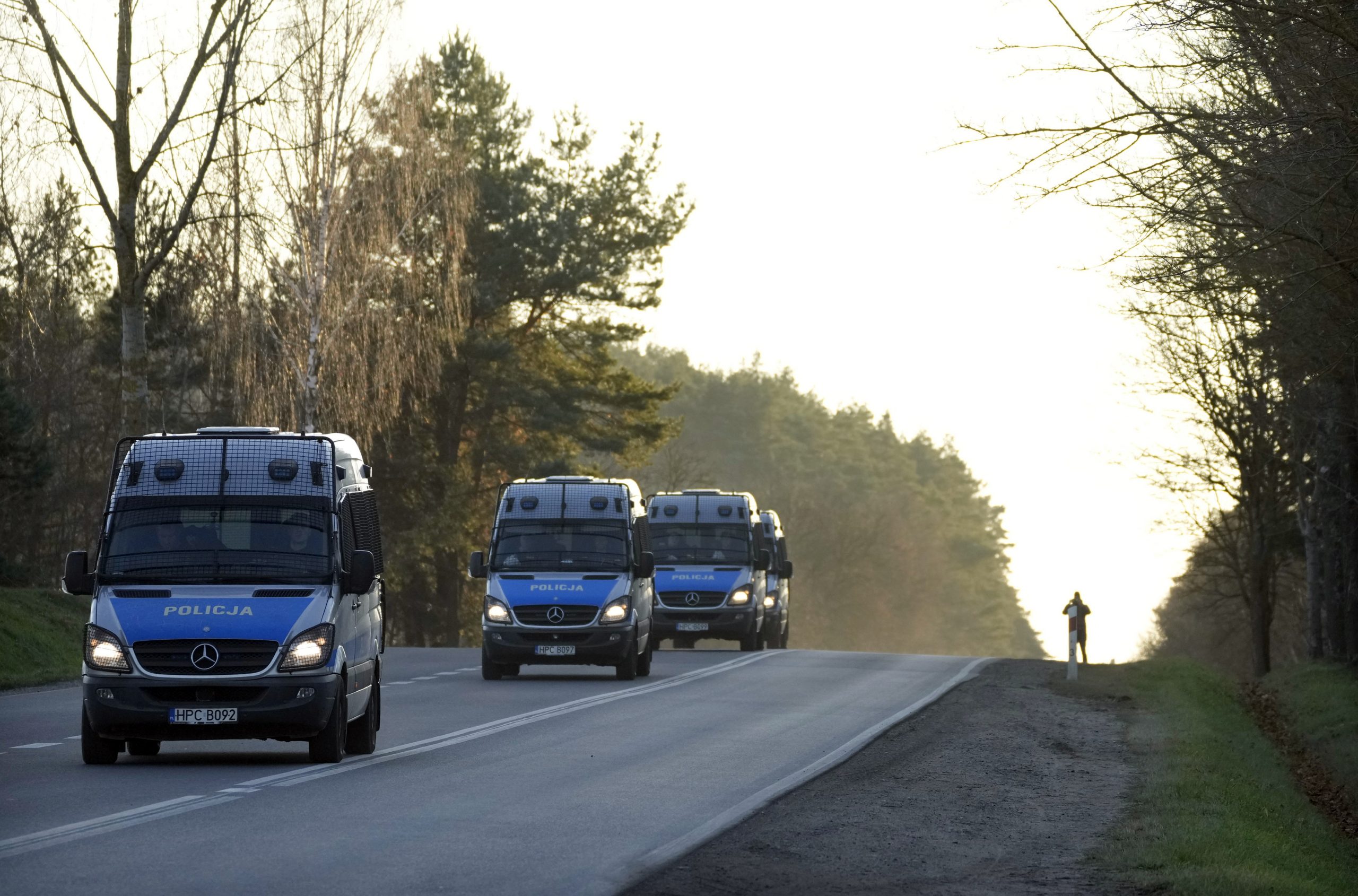 Polske politikjøretøy er på vei til Polens grense mot Hviterussland, ikke langt fra Kuznica den 9. november 2021. Foto: Czarek Sokolowski / AP / NTB.