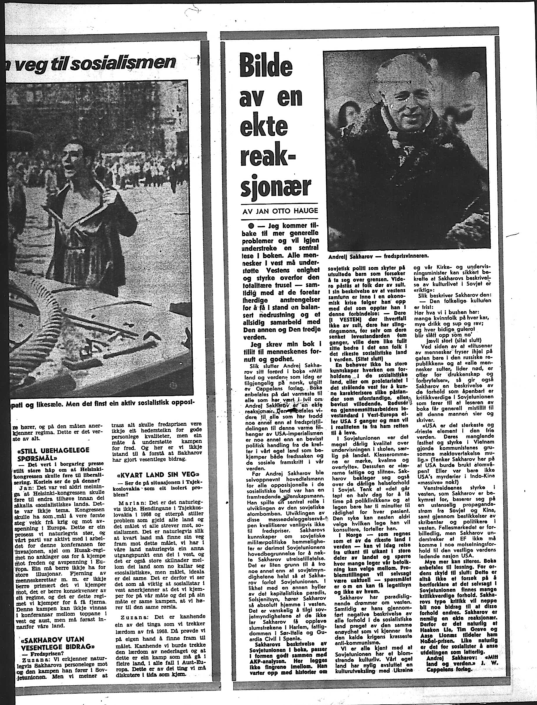 «Sakharovs kritikk [av Sovjetunionen] vil neppe bli noe bidrag til at disse forhold blir endret», het det i en omtale av prisvinnerens bok Mitt land og verden. «Sakharov er nemlig en ekte reaksjonær. Derfor er det naturlig at Haakon Lie (Ap’s tidligere partisekretær), Tim Greve (Nobelkomiteens sekretær) og Aase Lionæs (Nobelkomiteens leder) tildeler ham Nobelprisen. Like naturlig er det for sosialister å anse tildelingen som latterlig.»