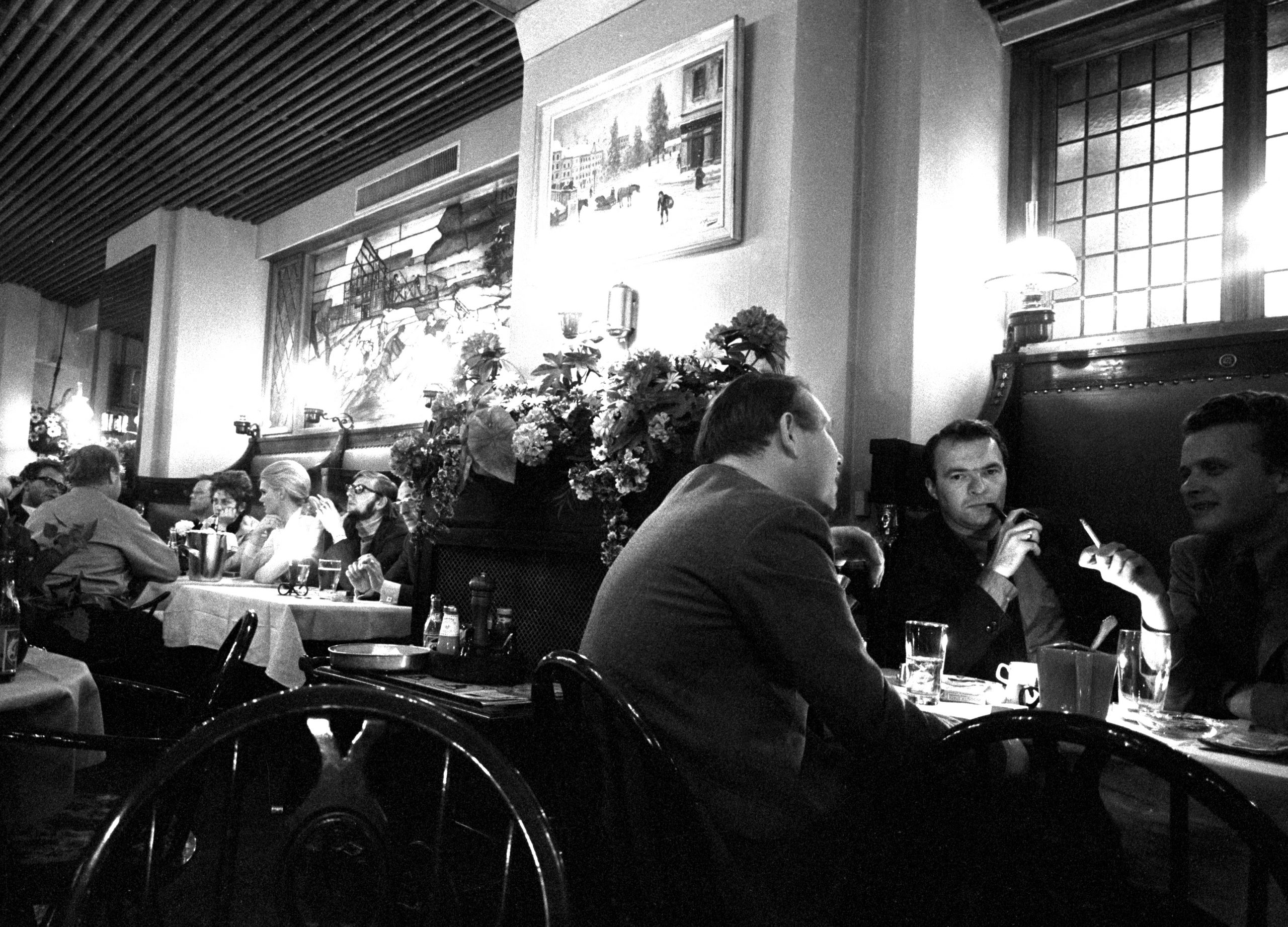 JUNI 1971: Dagbladets politiske redaktør Arve Solstad, Dagbladets politiske journalist Per Vassbotn og stortingsrepresentant Einar Førde (Ap) på Tostrupkjelleren i Oslo, i sin tid Norges politiske og journalistiske andedam rett ved Stortinget. Foto: Aage Storløkken / Aktuell / NTB.