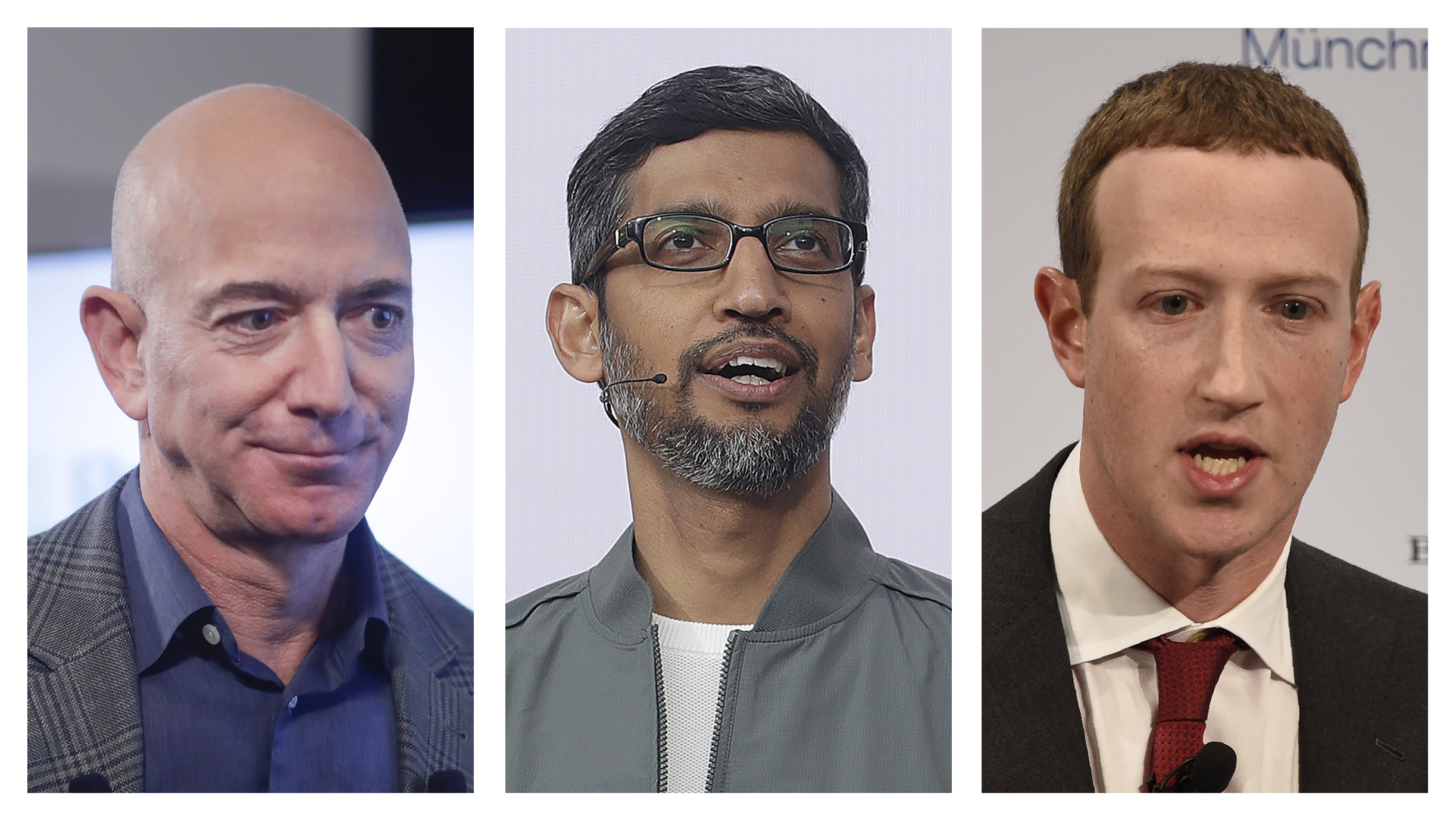 Toppsjefene i Amazon, Jeff Bezos, Google, Sundar Pichai og Facebook, Mark Zuckerberg. Foto: AP / NTB.