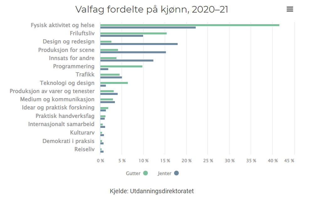 Statistikken fra direktoratet viser også at karaktersnittet i valgfag ligger høyere enn i andre fag, og at det er stor forskjell mellom hva gutter og jenter velger.