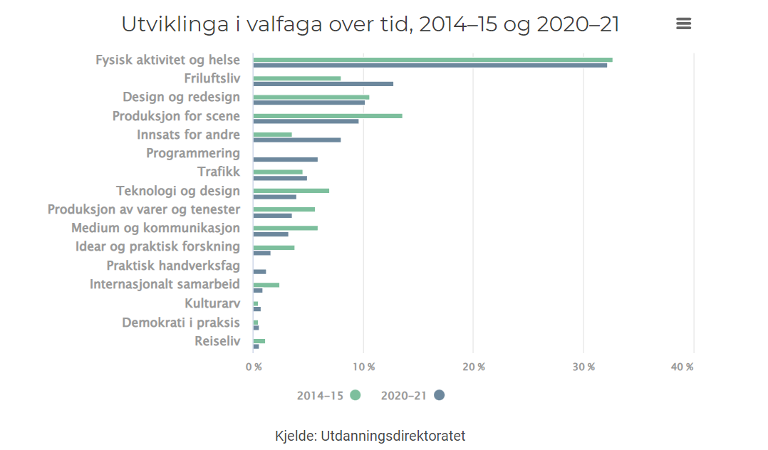 Hele 32 prosent velger fysisk aktivitet som valgfag, mens 12,8 prosent velger friluftsliv og 10,2 prosent design.