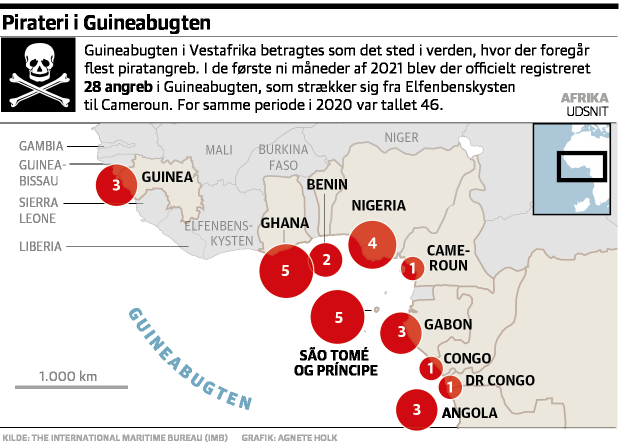 Den danske fregatten «Esbern Snare» havnet i ildkamp med pirater i Guineagulfen. Fire pirater ble drept, en såret. Ingen danske soldater er skadet.
