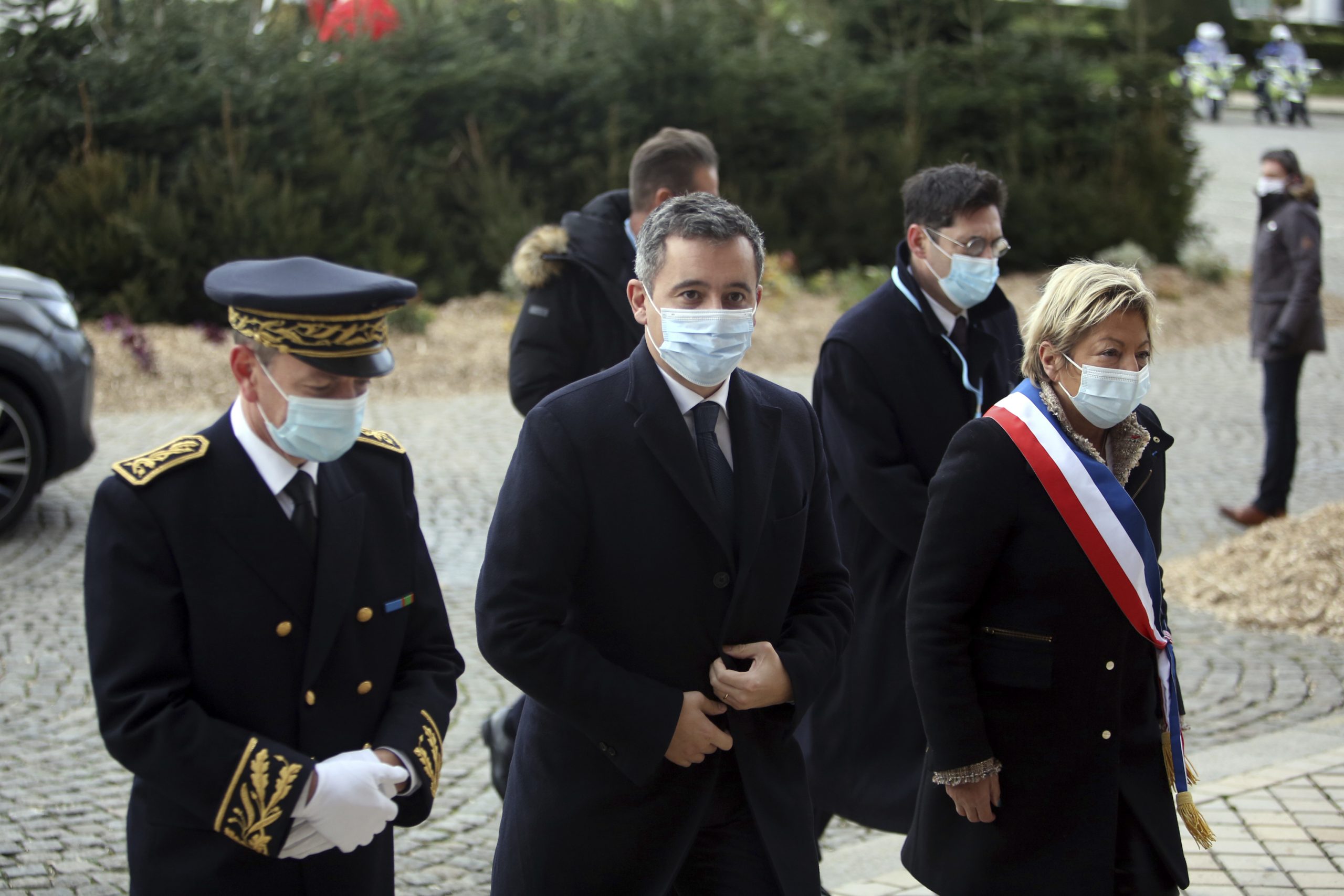 Frankrikes innenriksminister Gerald Darmanin (midten) ankommer et møte om migrasjonssituasjonen. Foto: AP Photo/Rafael Yaghobzadeh