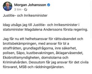 Det er nok ingen overdrivelse å si at Morgan Johansson har vært både den mest skadelige ministeren for Sveriges sikkerhet, og den mest upopulære blant innbyggerne. Men han klarer å klamre seg til taburettene og posisjonene, og Magdalena Andersson har nå takket ham ved å gi ham økt autoritet – i den nye regjeringen er Morgan Johansson både justis- og innenriksminister. Det betyr at han er ansvarlig for nesten hele Sveriges sikkerhet.