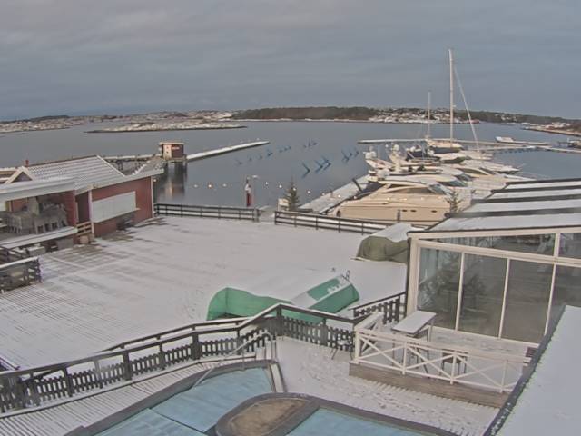 Øde, kald og forlatt i gjestehavna i Tanumstrand på den svenske vestkysten, mandag formiddag. Minus seks og rekordhøye strømpriser gjør ikke livet lystigere for folk som er vant med sol og sommer i den svenske skjærgården. Foto: TanumStrand