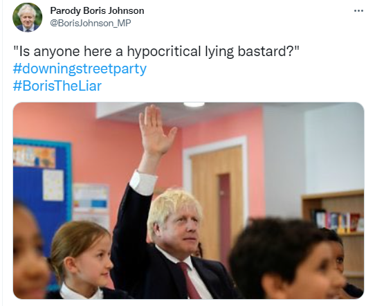 Britene begynner imidlertid å gå lei av Boris. Nå har han bablet for lenge. Han leder ikke lenger og han snur på femøringen med nye corona-restriksjoner. I tillegg ser det ut til at de ansatte i Downing Street ikke engang følger reglene som er pålagt alle andre. 18 desember i fjor ble det holdt et ulovlig party for de ansatte i Downing Street. Det er å gjøre narr av folk.