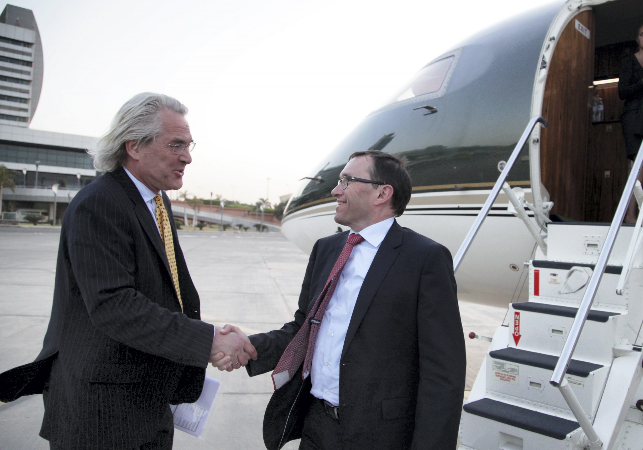 TIDEN GÅR, INKOMPETANSEN BESTÅR. 2. april 2013: Norges ambassadør til Egypt Tor Wennesland, i dag FN-koordinator for «fredsprosessen i Midtøsten», tar imot utenriksminister Espen Barth Eide, i dag klimaminister, på flyplassen i Kairo. Foto: Steinar Schjetne / NTB.