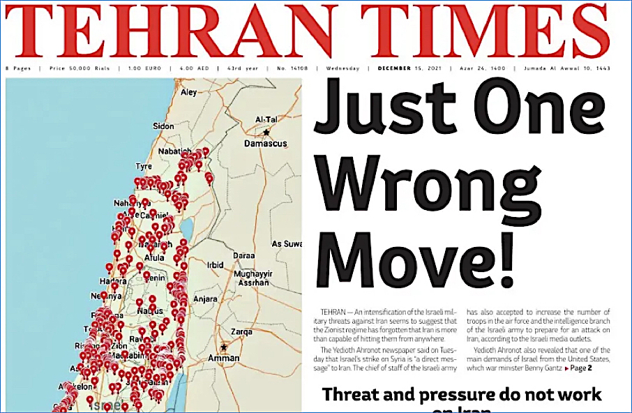 BOMBEMÅL: Den offisielle avisen Tehran Times viste bombemål i Israel med røde knappenåler på et kart som ble publisert like før jul. Tittelen var lett å forstå: Ikke ett feilsteg (vil bli tålt)!