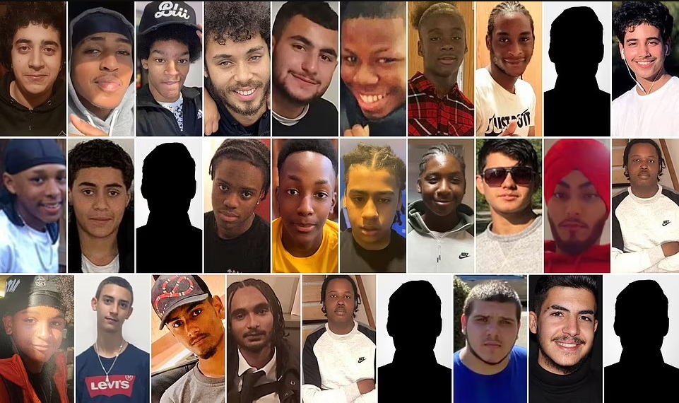 30 knivdrepte tenåringer er registrert for London i 2021. Dermed passerte man den tidligere deprimerende rekorden fra 2008 på 29 personer. De drepte er som regel involvert i gjengkriminalitet og de har som regel minoritetsbakgrunn. Bildet viser ofrene, men det ville være svært overraskende om ikke en fotokompilasjon av drapsmennene ville se tilnærmet lik ut.