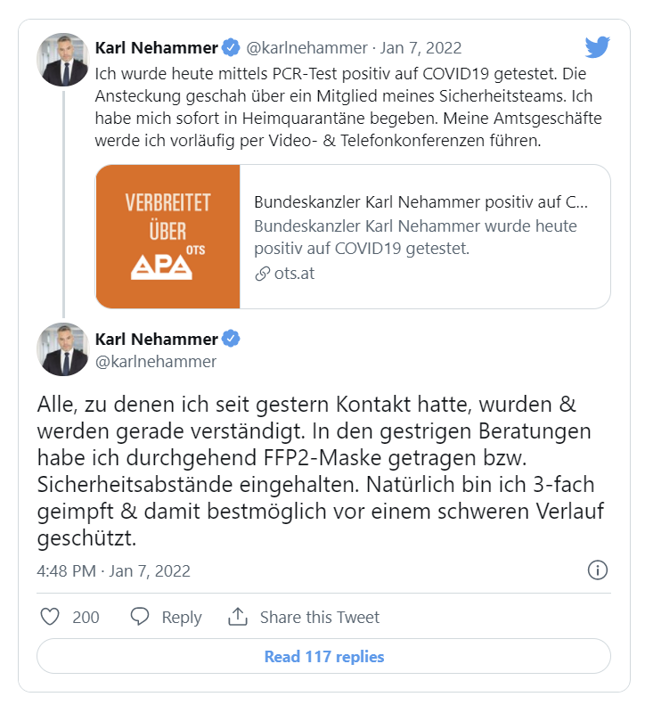 Den østerrikske kansleren har presset gjennom harde nedstengninger og vedtak om obligatorisk vaksinasjon for befolkningen. Til tross for dette har han nå selv blitt syk av covid-19. Neste måned vil det bli innført vaksinasjonskrav for alle innbyggere og staten vil nå bestille vaksinasjonstider for alle vaksinerte. Alle som ikke møter til sin bestilte tid må betale en bot på inntil 3600 Euro.
