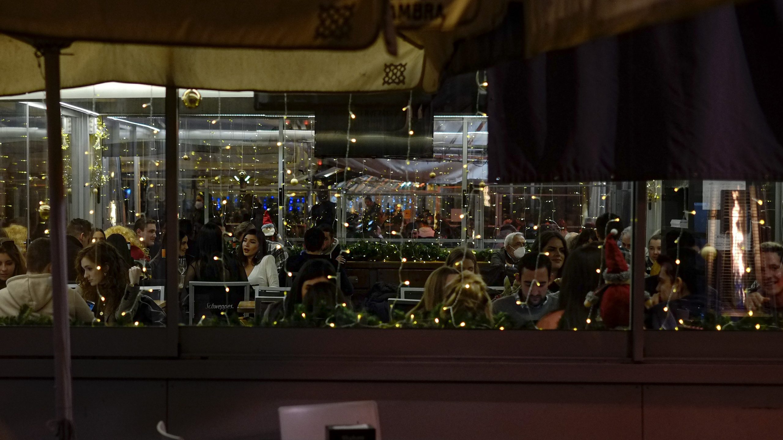 Folk sitter på terrassen ved en bar i Pamplona den 8. januar 2020. Foto: Alvaro Barrientos / AP / NTB.