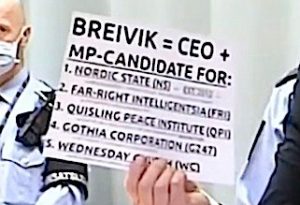 Breivik befinner seg gjerne i sentrum og benytter anledningen: Før retten settes, lirer han av seg en harang om at hvite nasjonalister er i ferd med å «signere» med Kina, Russland og Iran. Hvis ikke «tilbudet» blir mottatt, dvs. hvis de ikke får sine krav innfridd, vil hans gruppering inngå i en slik allianse. Han bruker ordet «signering» på en original måte.