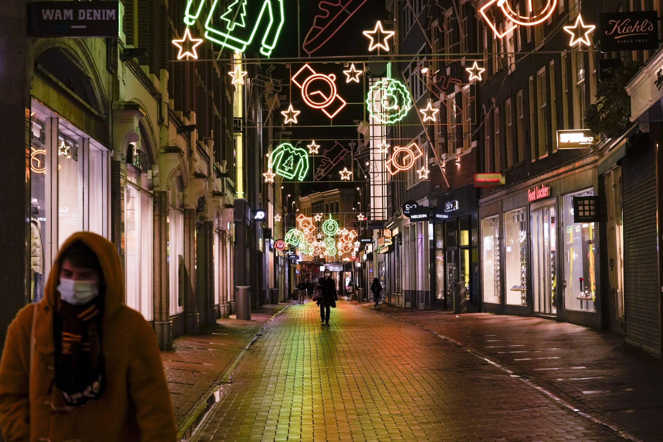 Handlegatene i Amsterdam er nesten folketomme under korona-lockdown den 29. november 2021. Foto: Peter Dejong / AP / NTB.