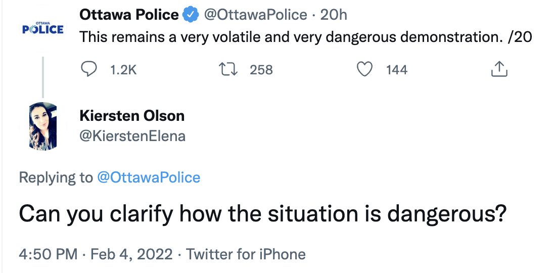 Ottawa Police also levelled politically charged accusations at protesters, including that they are violent and dangerous: police statistics show this is not the case.