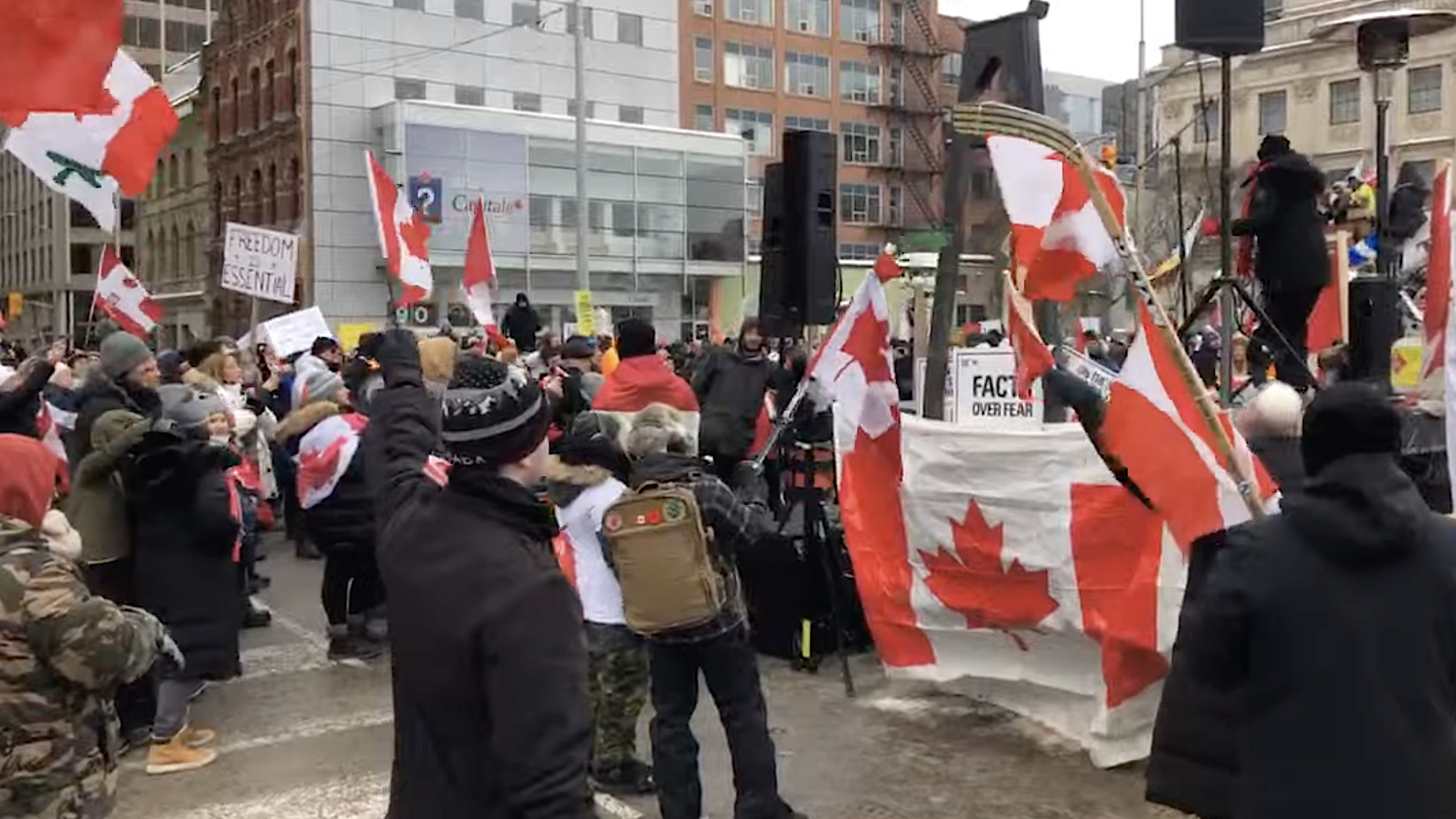 Demonstranter synger den canadiske nasjonalsangen i Ottawa. Stillbilde: Newsly Canada / YouTube.