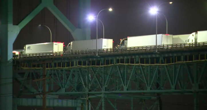 Kanadiske lastebilsjåfører stengte grensebroen Ambassador bridge, mellom Canada og den amerikanske delstaten Michigan, mandag. Broen var stengt ut i tirsdagens morgentimer.