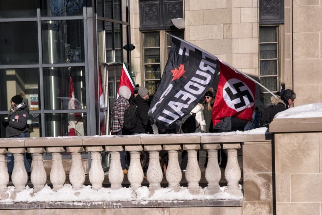 Nazi flagg ved parlamentet i Ottawa 29 januar. Det er allment antatt at dette var en provokasjon slik at mediene kunne stemple demonstrantene. Det er utlovet en belønning på 6.500 dollar for den som identifiserer mannen. Flagget har fremdeles folder som viser at det nettopp er pakket ut. En mann som kjørte inn i demonstrantene i Winnipeg er avslørt som Antifa. foto: Vlad Tepes