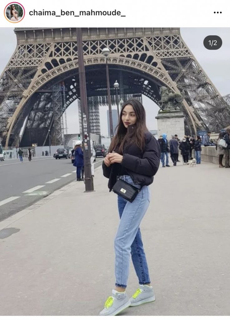 Chaima Ben Mahmoude poserer ved Eiffeltårnet. Foto: Stillbilde fra Instagram/Mahmoude