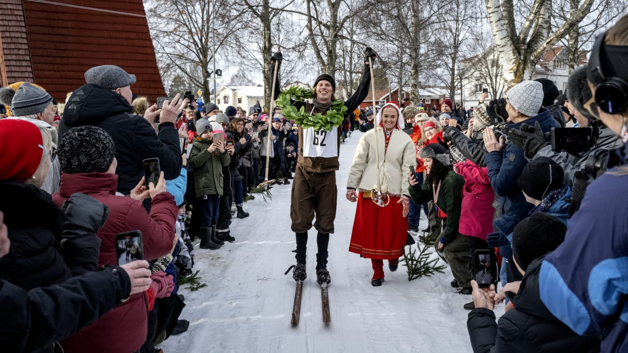 Jubileumsfestligheter under vinterlige forhold ved Vasaloppets mål i Mora. Foto: Vasaloppet.
