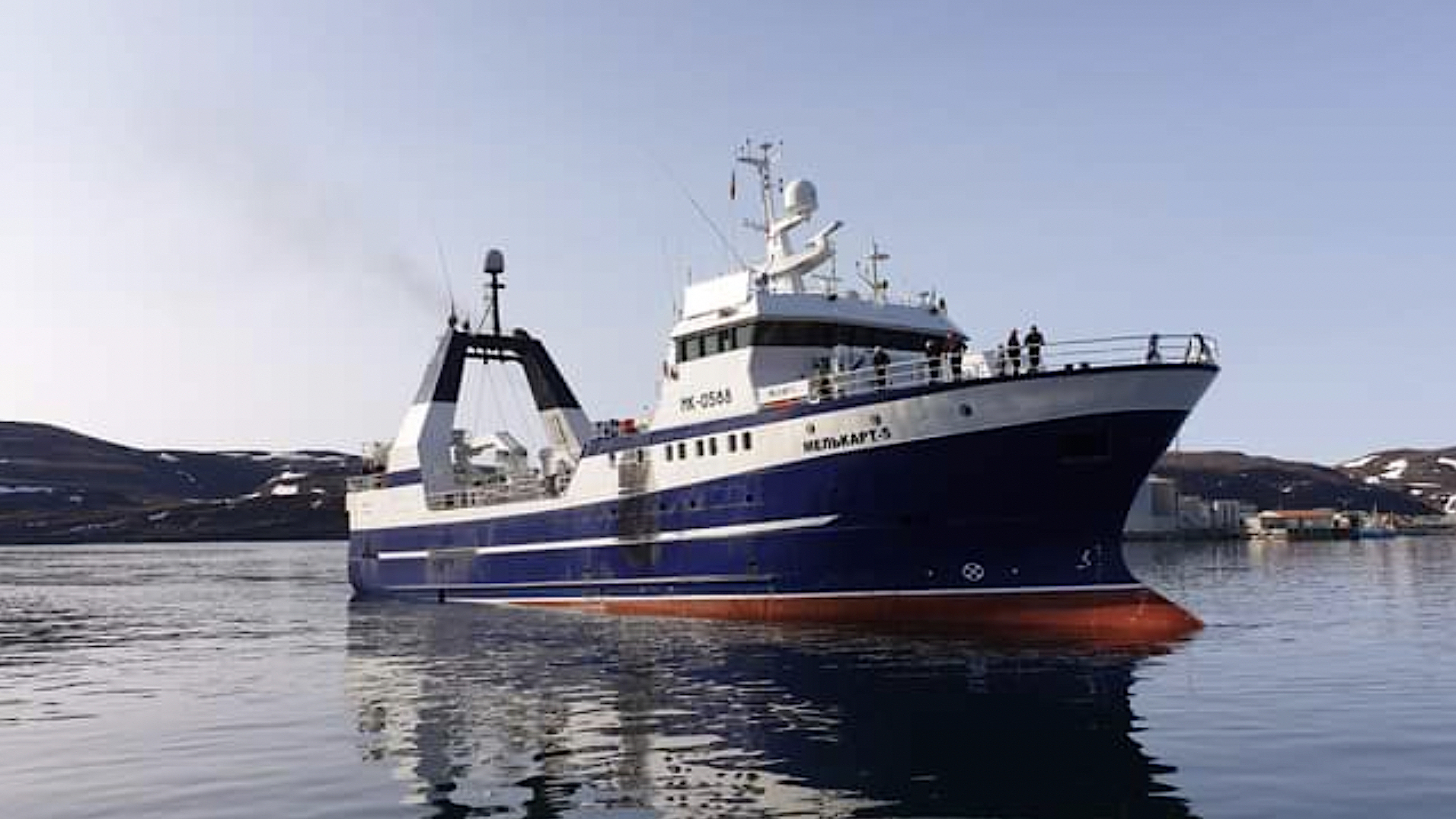 TIDLIGERE NORSKEID: «Melkart 5» ble bygd av Vard i 1996 for antakelig grønlandske eiere, ble siden solgt og seilte fram til 2018 under navnet «Kongsfjord» som en del av Lerøy Seafoods flåte, da fartøyet ble solgt til et selskap i Murmansk. Foto: Båtsfjord Havn KF / Facebook.