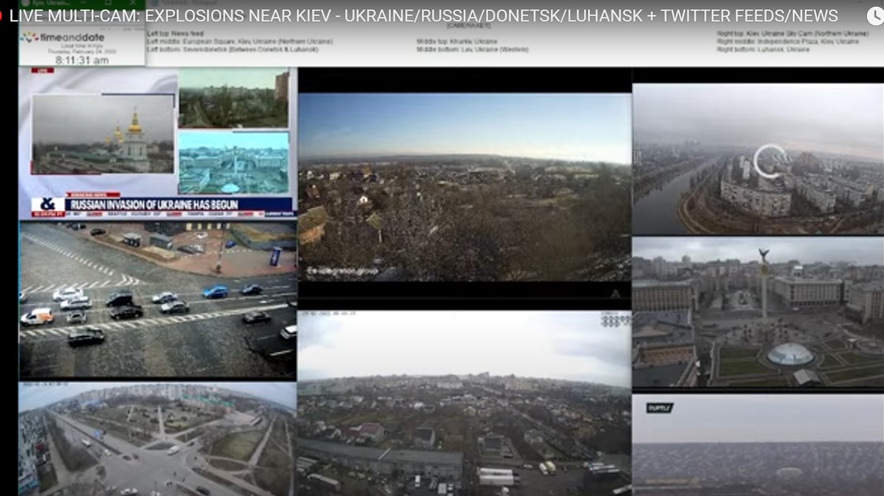 Den amerikanske frilans-videoprodusenten Tim Gray har samlet live feeds fra en rekke lokasjoner i Ukraina og Hviterussland, og han legger også ut nyhetsvideoer fra forskjellige nyhetskanaler. Disse sendes direkte på YouTube, og vi videreformidler her.