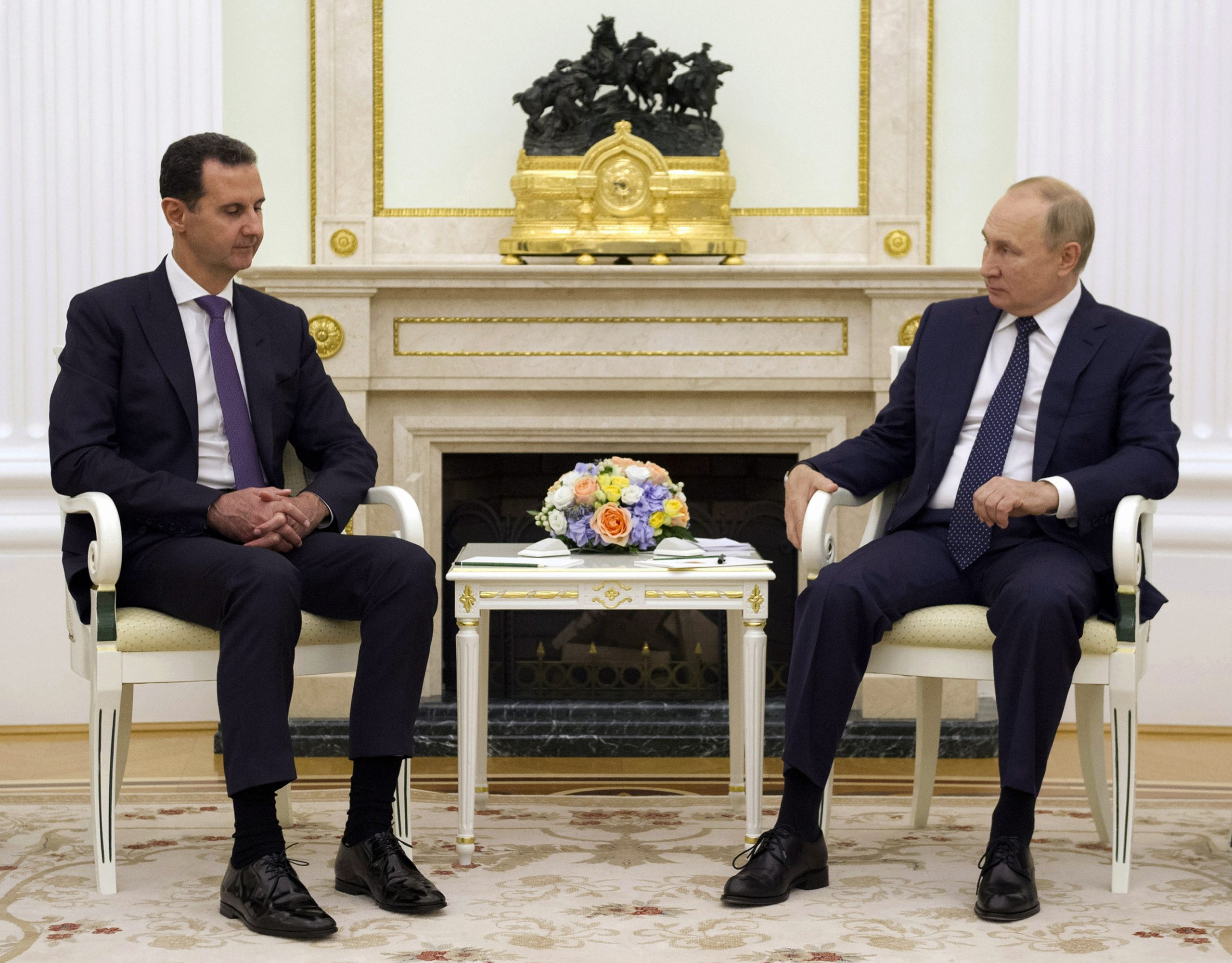 Like barn leker best: Russlands president Vladimir Putin (h) i samtale med en av sine få støttespillere i Ukraina-krigen, Syrias diktator Bashar Assad. Foto: Mikhail Klimentyev, Sputnik, Kremlin Pool Photo via AP, File.