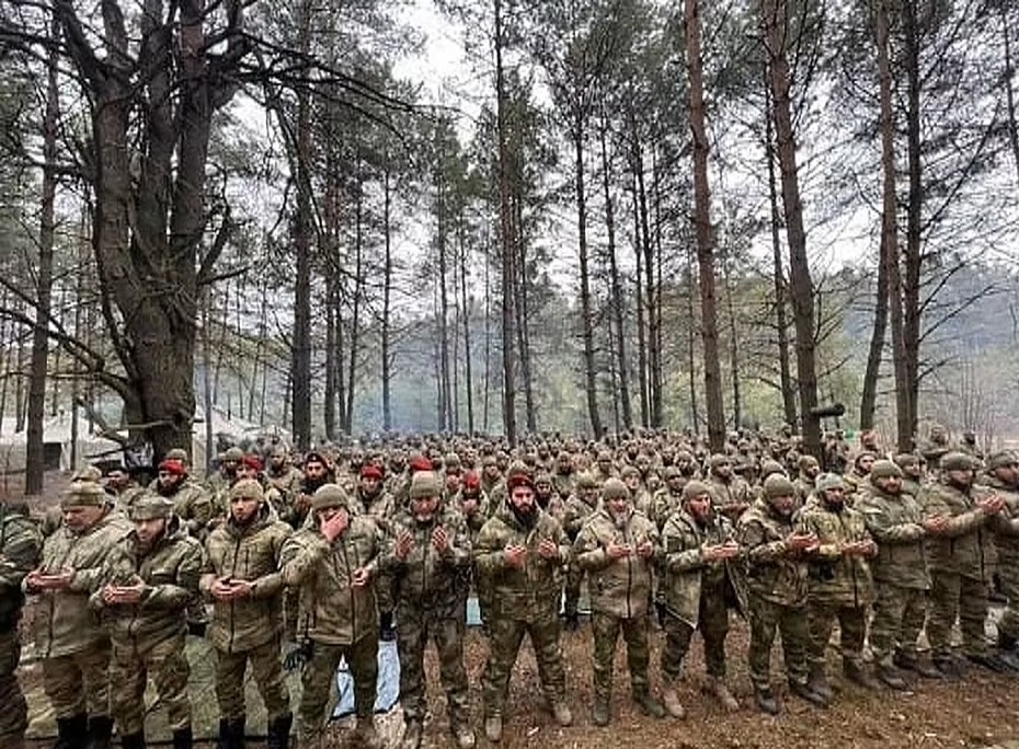 Tsjetsjensk «drapsavdeling» har bønnemøte før de skal jakte på ukrainere. Foto: Skjermbilde sosiale medier.