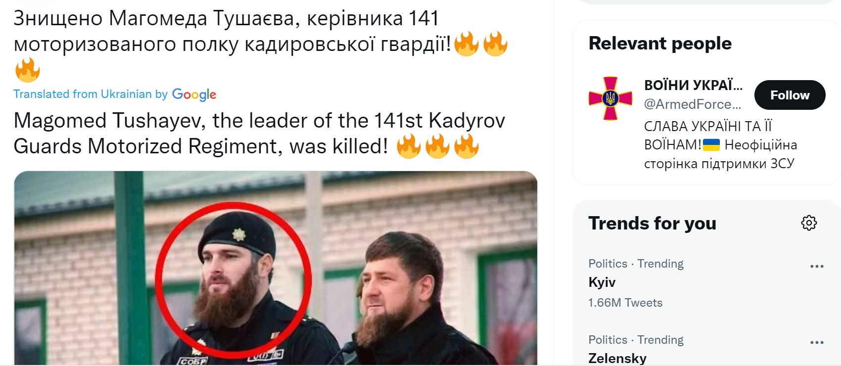 Nyheten om at en tsjetsjensk panserkolonne ble knust og deres general Magomed Tushayev drept lørdag, ble først presentert på Twitter-kontoen til det ukrainske forsvaret: