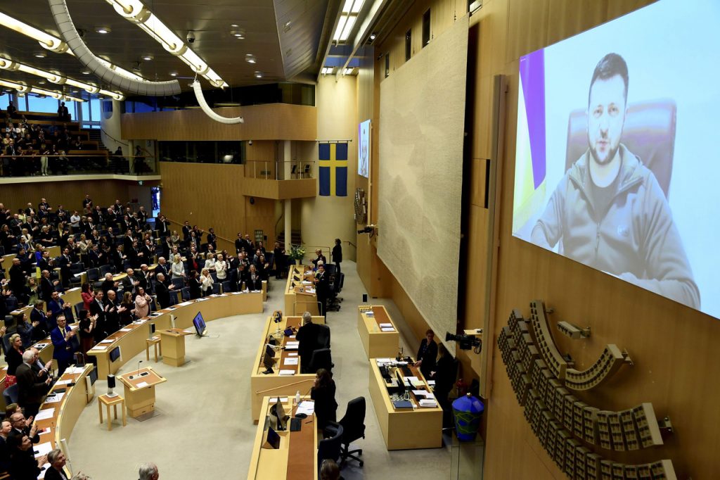 I dag talte Ukrainas president Volodymyr Zelenskyj til Sveriges riksdag. Svenske statsråder og parlamentarikere ga Zelenskyj stående ovasjoner etter talen.