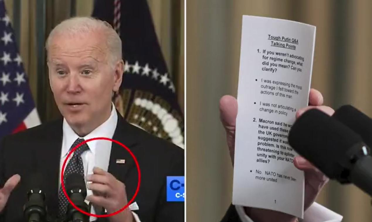 Mandag avholdt president Joe Biden en ny pressekonferanse om den russiske invasjonen i Ukraina. I venstre hånd holdt presidenten huskelapper med forventede spørsmål og de forhåndsvalgte svarene som staben hans har utstyrt ham med.