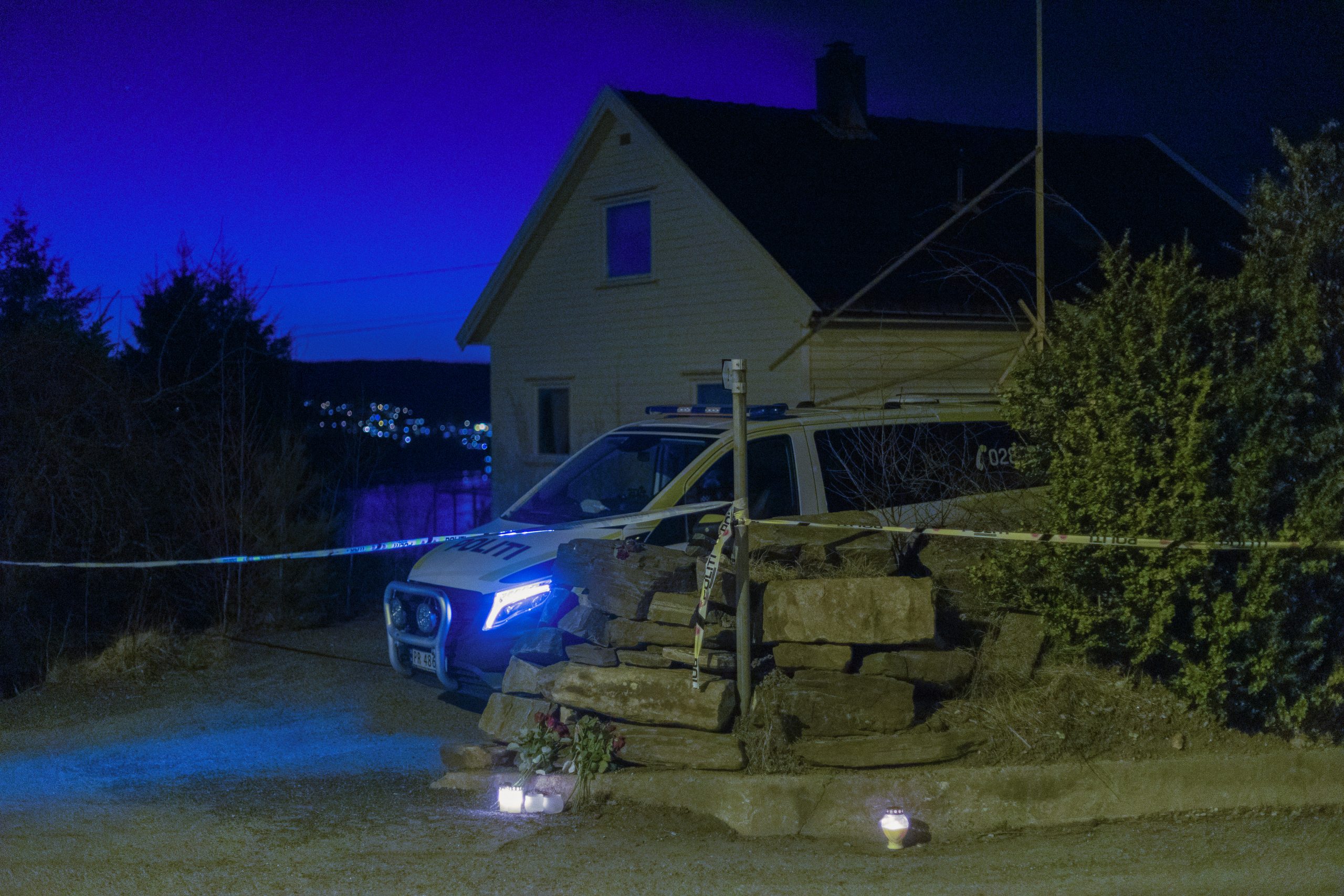 Politi i Kristiansand der to kvinner ble drept mandag. Foto: Tor Erik Schrøder / NTB