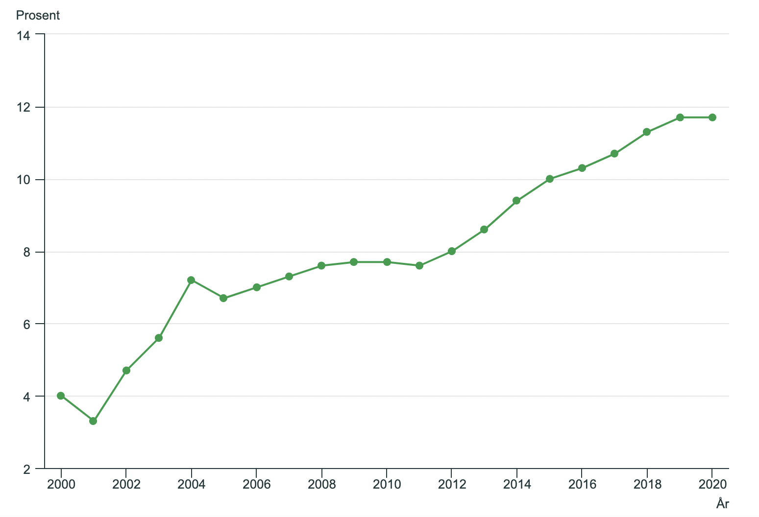 NTB fremhever at andelen har holdt seg stabil siden 2019. Statistikk fra SSB viser imidlertid at den har steget raskt siden årtusenskiftet, da andelen var 4 prosent: