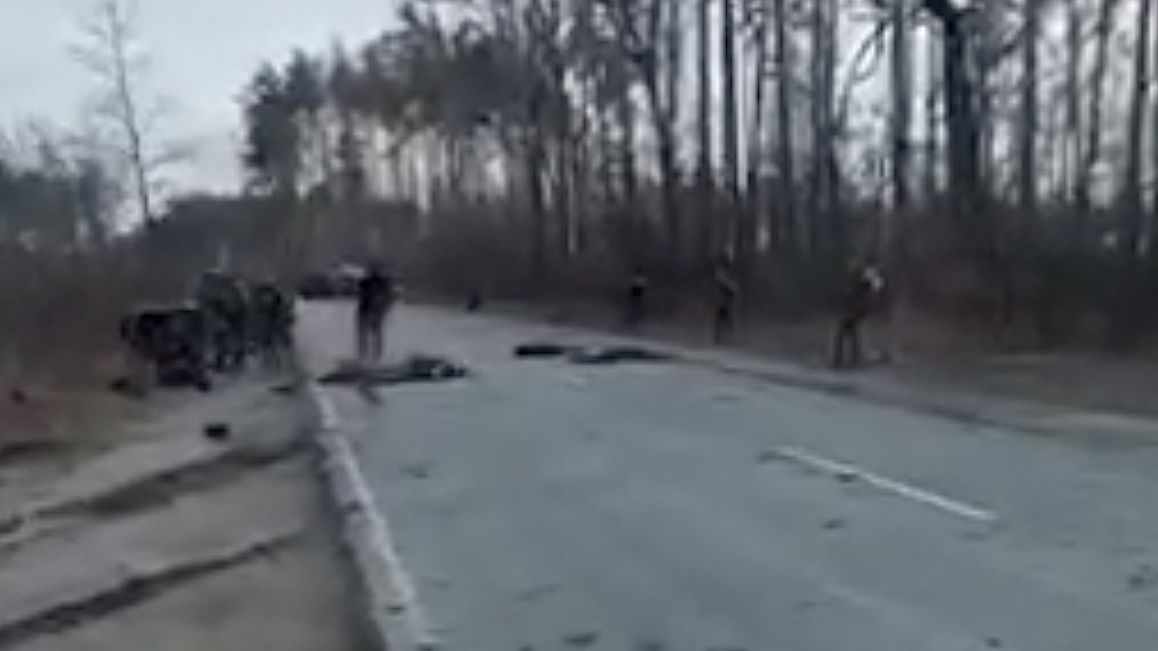 Soldatene ligger på veien, like ved et infanterikjøretøy av typen BMD-2, som brukes av russiske styrker. Noen av soldatene ser ut til å ha fått jakker, sko og hjelmer fjernet. Lenger borte på veien kan man se ødelagte kjøretøy.