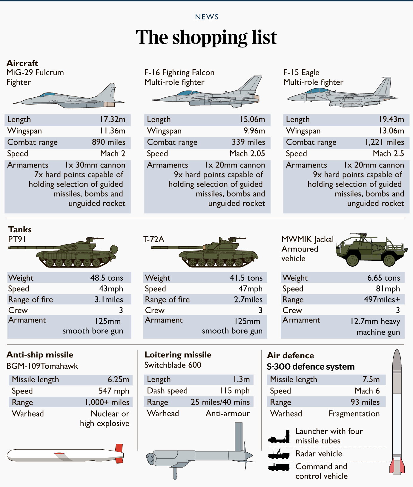 Ukraina har bedt om leveranser av fly, stridsvogner, pansrede kjøretøy, artilleri og missiler som kan brukes mot krigsfartøy og luftangrep.