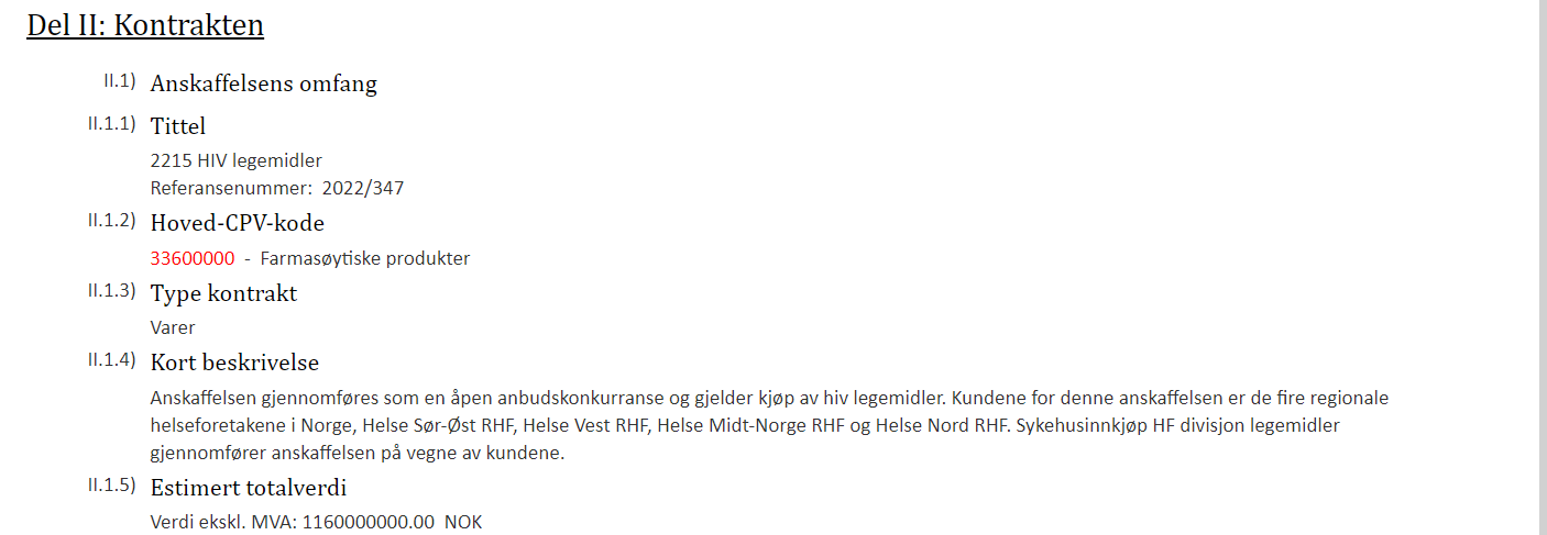 Doffin (Databasen for offentlige innkjøp) utlyste nylig, i tråd med EØS-bestemmelsene, en anbudskonkurranse for innkjøp av legemidler mot HIV. Flere har reagert på at kontraktsverdien er satt til over 1,1 millard kroner, noe som er mer enn det dobbelte for forrige rammeavtale.